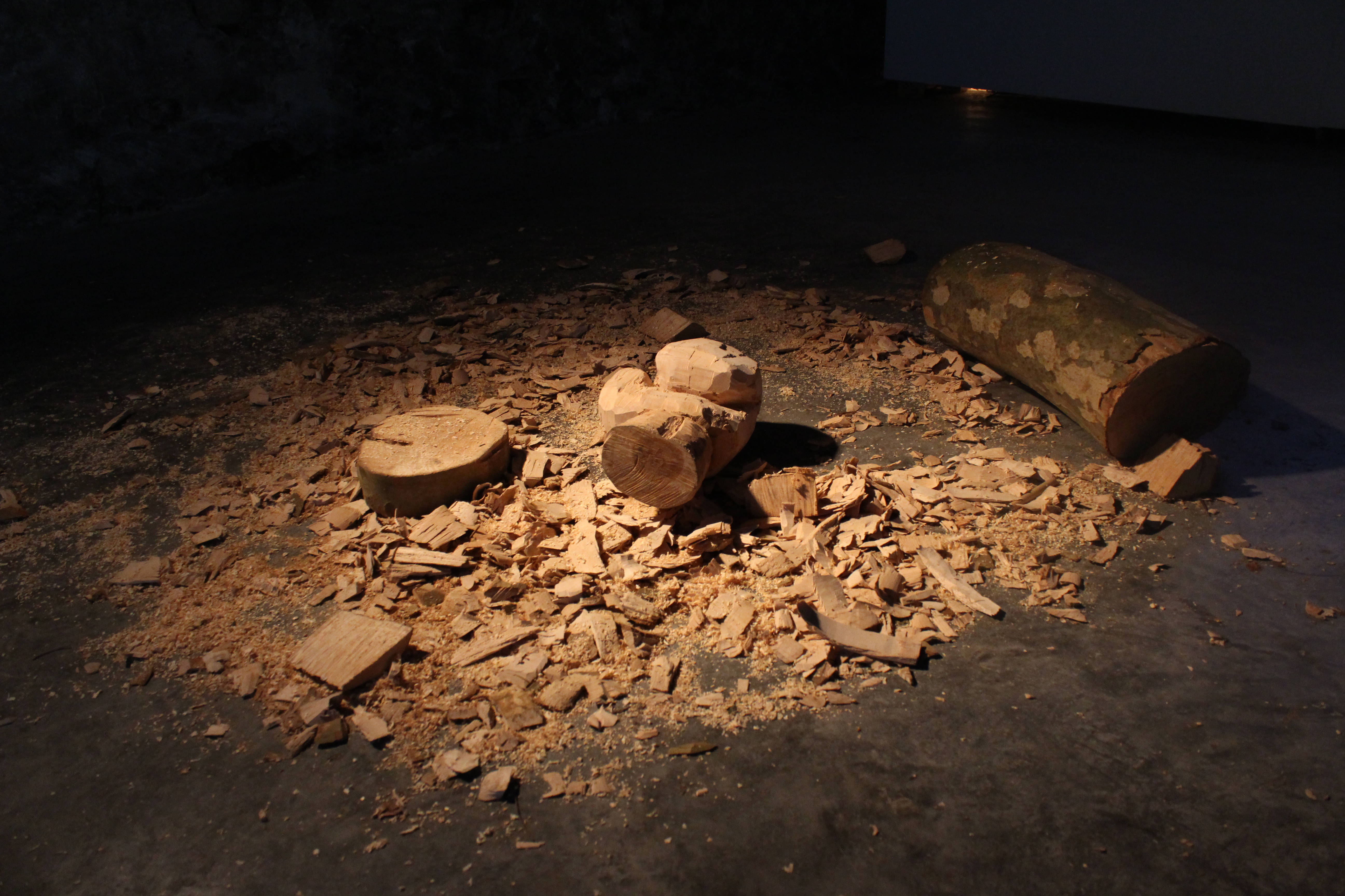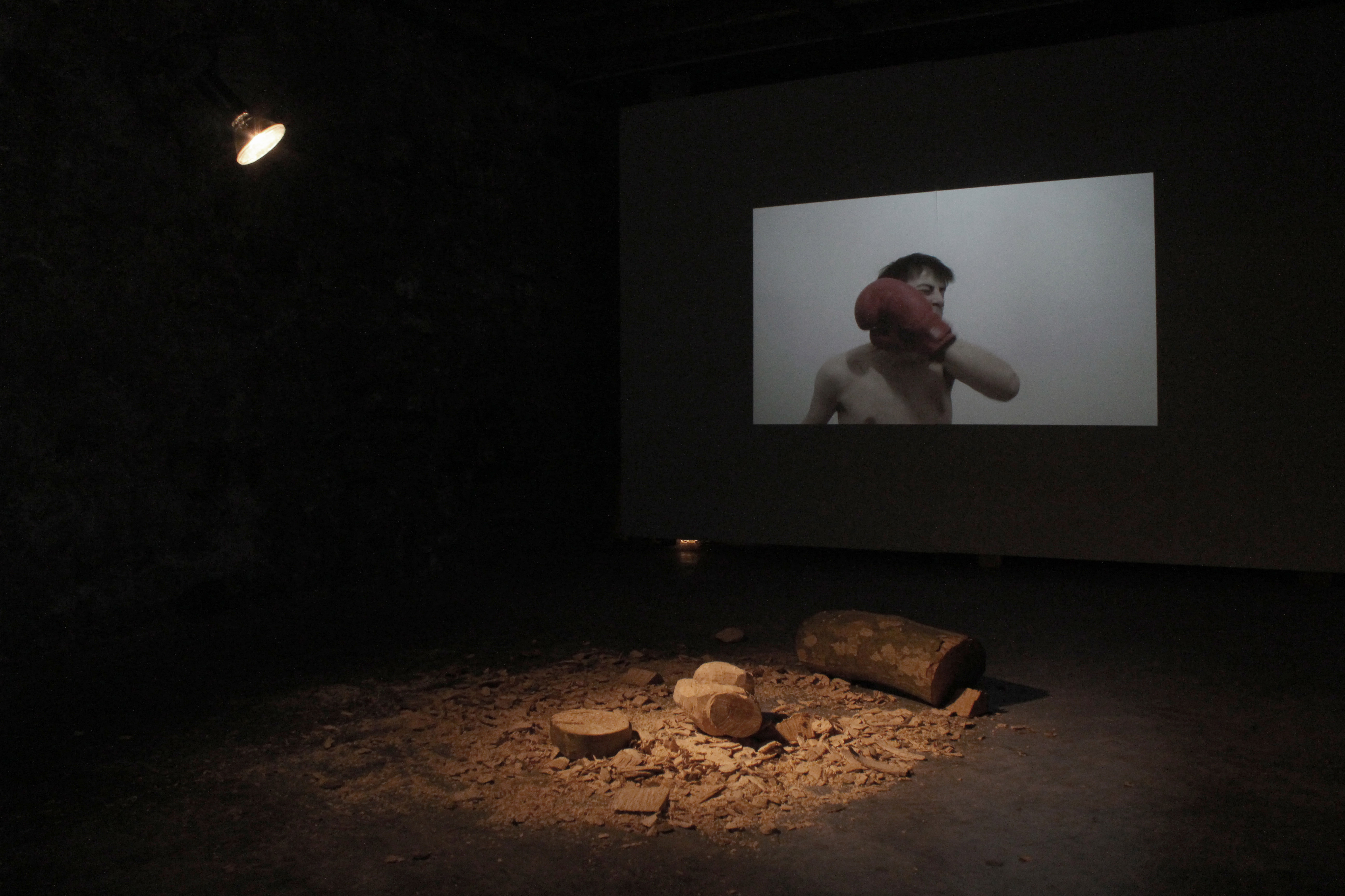 Cette vidéo pend la forme d’une installation par l’activation d’une performance sculptée de 24h. Cette performance donne lieu à la taille d’un tronc de platane qui prend petit à petit la forme d’un gant de boxe.