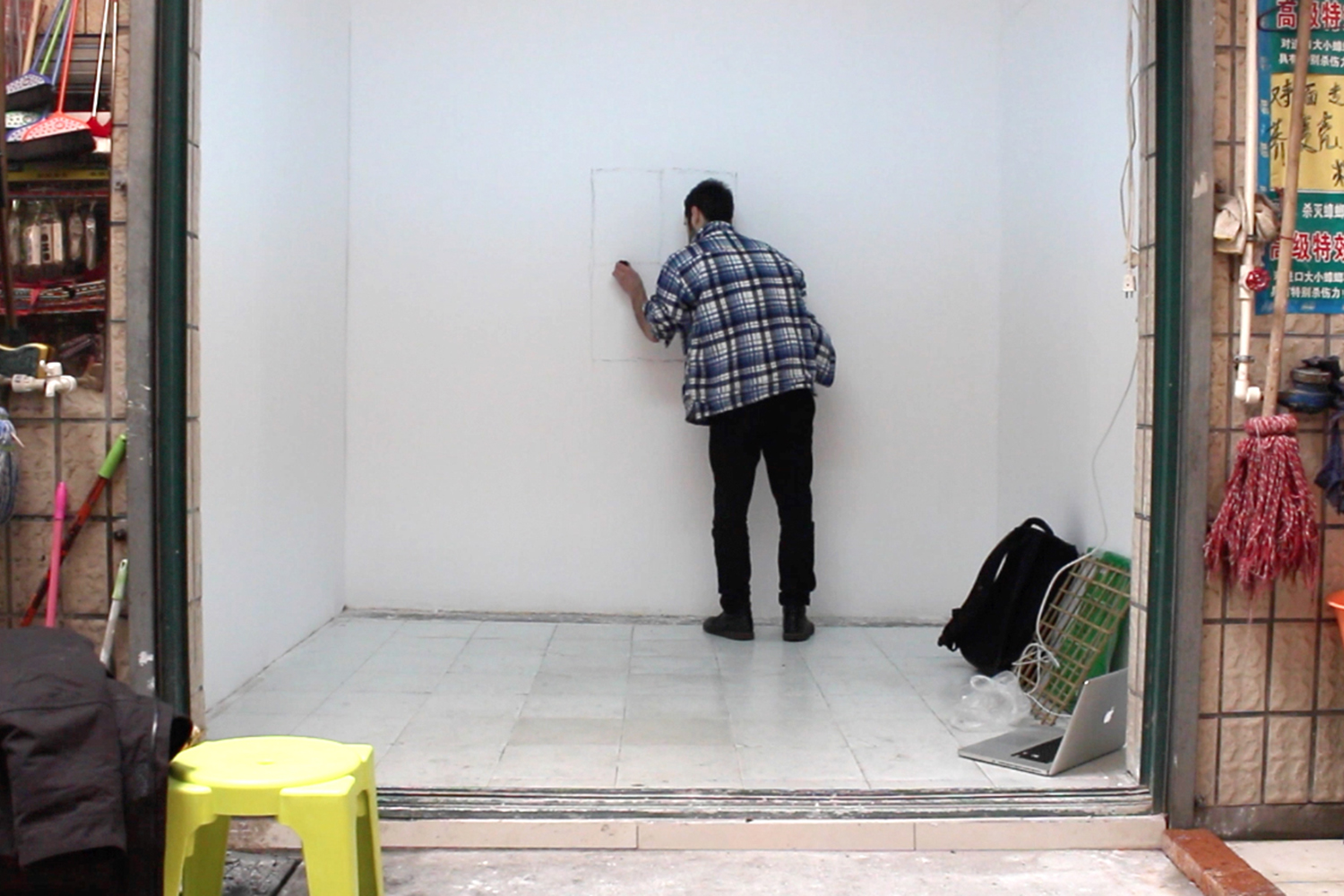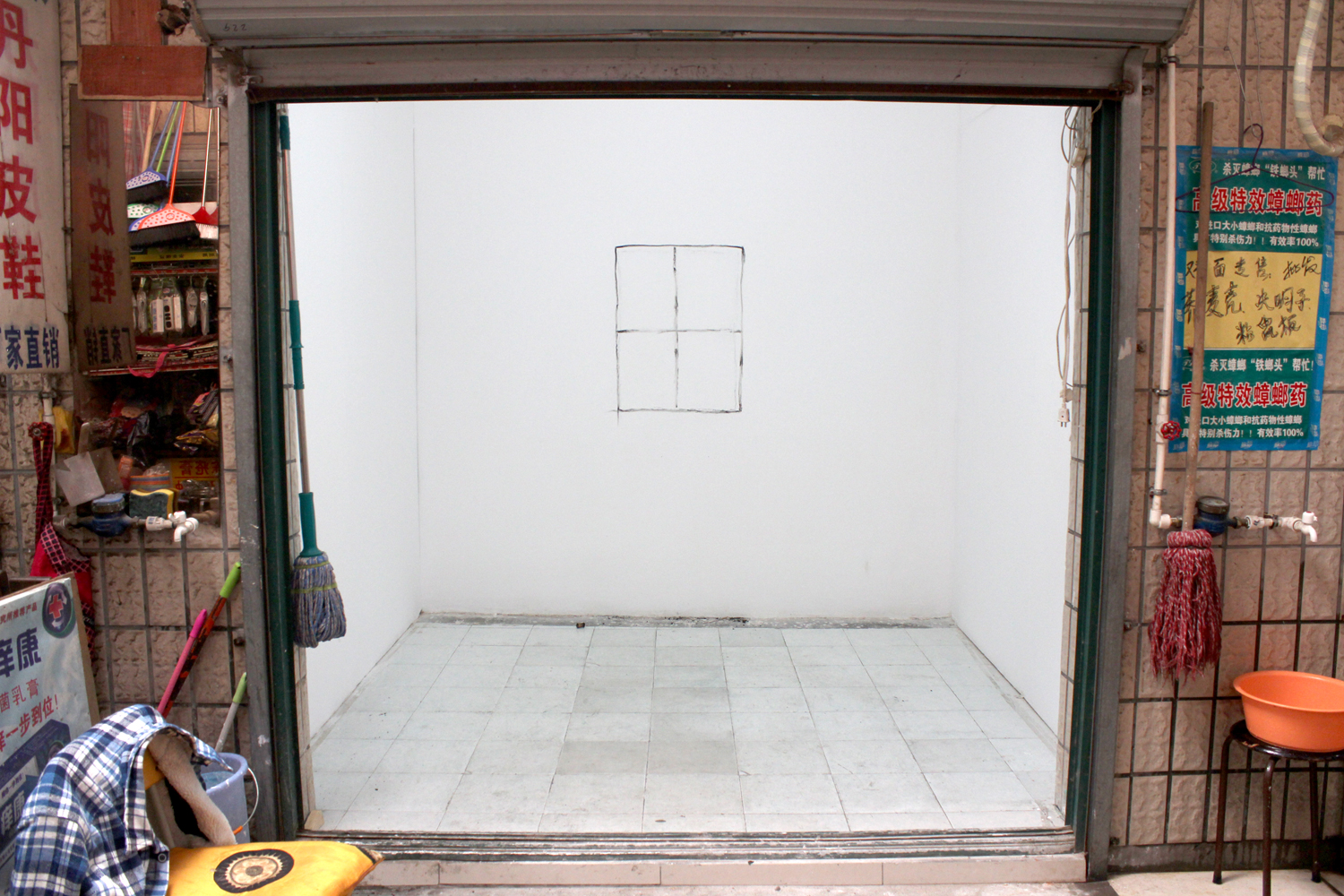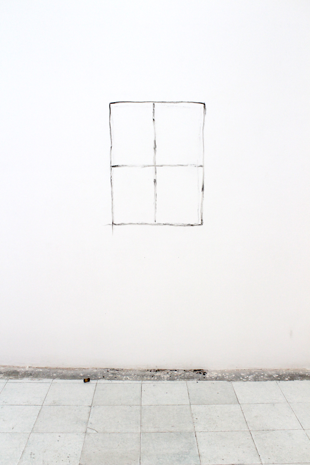 Invité par l’artiste/commissaire Arthur Debert sur l’idée de déplacement, il a fallu se procurer un morceau de charbon chez un commerçant de cette rue « bazar » où se trouvait l’espace d’exposition. À la manière de Benigni dans Dawn by Law, dessiner une fenêtre avec ce morceau de « rien » pour ouvrir un espace mental, imaginer un décor dans une cellule afin de pouvoir se transporter dans un ailleurs. La fenêtre est aujourd’hui aussi celle que l’on ouvre sur un écran, les possibles d’une génération qui relèvent du voyage immobile.